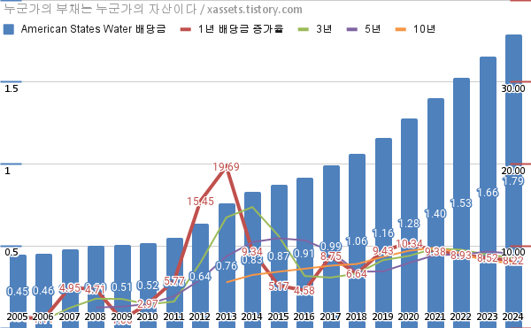 아메리칸 스테이츠 워터 배당금 및 배당성장률 차트 (2005년~2024년)