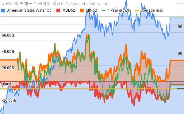 - 아메리칸 스테이츠 워터의 10년 평균 MDD는 -8.58%고, 52주 최저가 대비 평균 상승률은 20.07%다.