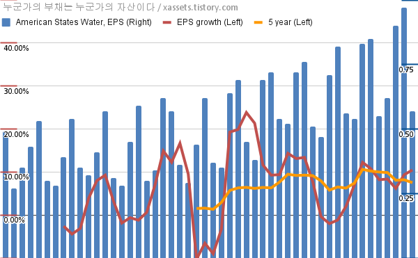 - 포스팅일 기준, 아메리칸 스테이츠 워터의 1, 5년 연평균 EPS 성장률은 10.47%, 7.51%이다.
