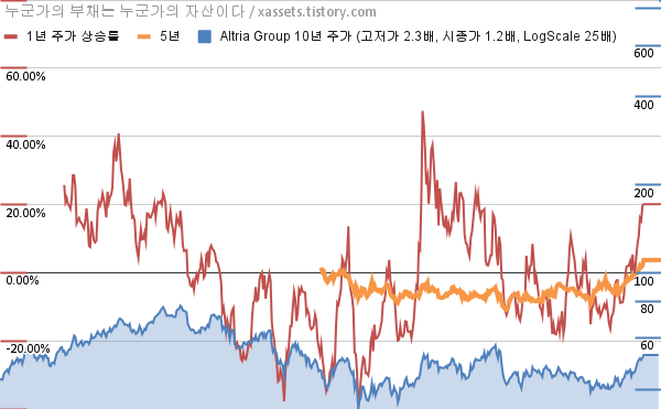 - 포스팅일 기준, 알트리아 그룹의 1, 3, 5, 10년 연평균 주가상승률은 20.08%, 1.92%, 3.69%, 1.91%이다.