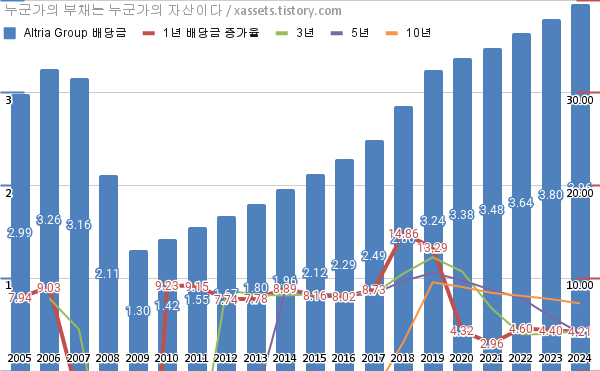 - 알트리아 그룹의 연평균 배당성장률은 1년 4.21%, 3년 4.40%, 5년 4.10%, 10년 7.29%이다. (2024년 기준)