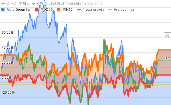 - 알트리아 그룹의 10년 평균 MDD는 -12.24%고, 52주 최저가 대비 평균 상승률은 16.16%다.