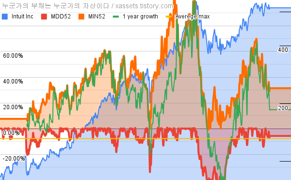 - 인튜이트의 10년 평균 MDD는 -7.79%고, 52주 최저가 대비 평균 상승률은 39.23%다.