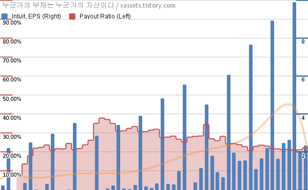 인튜이트 EPS 성장률, 배당성향 차트 (2011년~2024년)