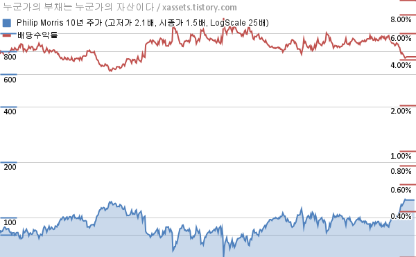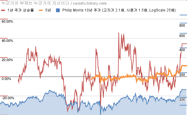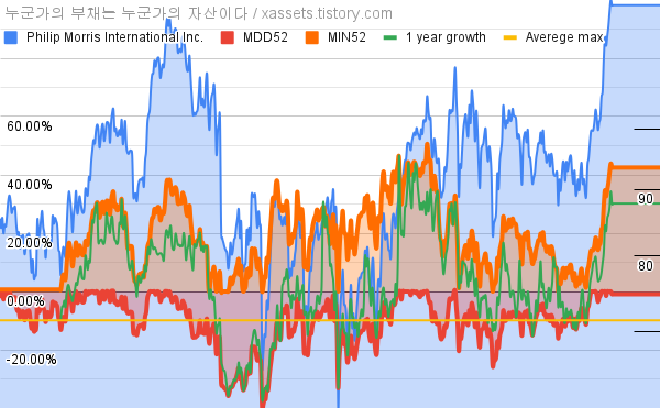 - 필립모리스의 10년 평균 MDD는 -9.88%고, 52주 최저가 대비 평균 상승률은 19.75%다.