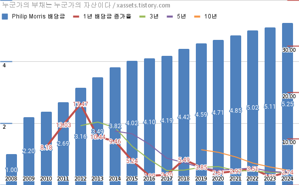 - 필립모리스의 연평균 배당성장률은 1년 2.74%, 3년 2.68%, 5년 2.72%, 10년 3.23%이다. (2024년 기준)