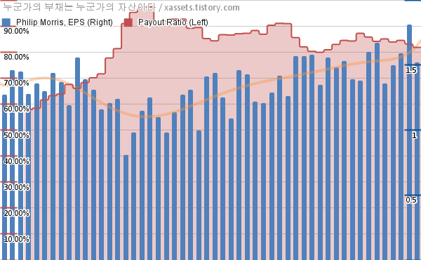 필립모리스 EPS 성장률, 배당성향 차트 (2012년~2024년)