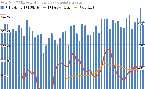 - 포스팅일 기준, 필립모리스의 1, 5년 연평균 EPS 성장률은 6.82%, 4.31%이다.