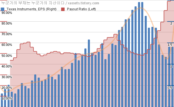 텍사스 인스트루먼트 EPS 성장률, 배당성향 차트 (2012년~2024년)