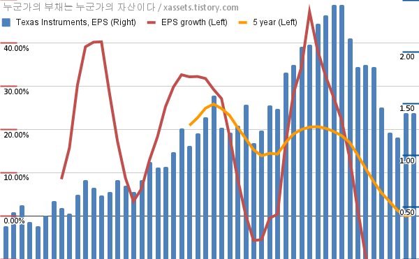 - 포스팅일 기준, 텍사스 인스트루먼트의 1, 5년 연평균 EPS 성장률은 -25.89%, 0.35%이다.