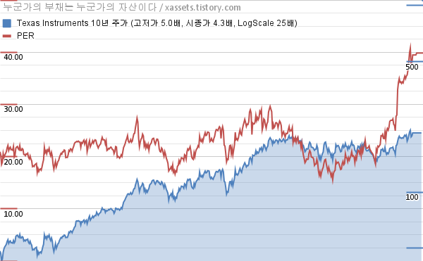 텍사스 인스트루먼트 PER 차트 (2014년~2024년)