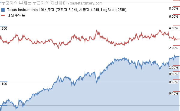 텍사스 인스트루먼트 배당수익률 및 주가 상승률 차트 (2014년~2024년)