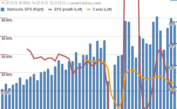 - 포스팅일 기준, 스타벅스의 1, 5년 연평균 EPS 성장률은 -2.16%, 4.75%이다.