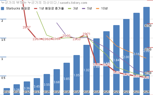 스타벅스 배당금 및 배당성장률 차트 (2010년~2024년)