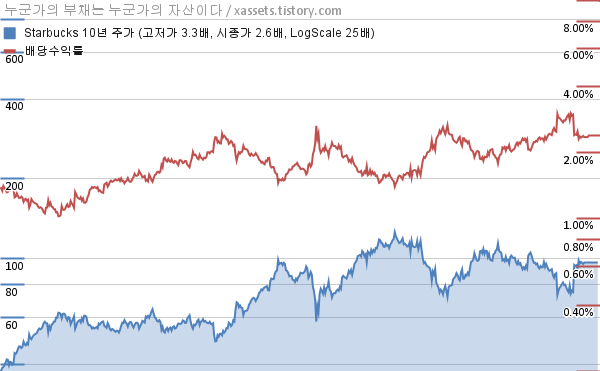스타벅스 배당수익률 및 주가 상승률 차트 (2014년~2024년)