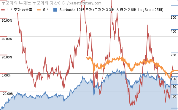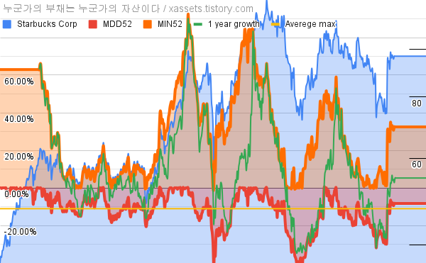 - 스타벅스의 10년 평균 MDD는 -11.07%고, 52주 최저가 대비 평균 상승률은 27.14%다.