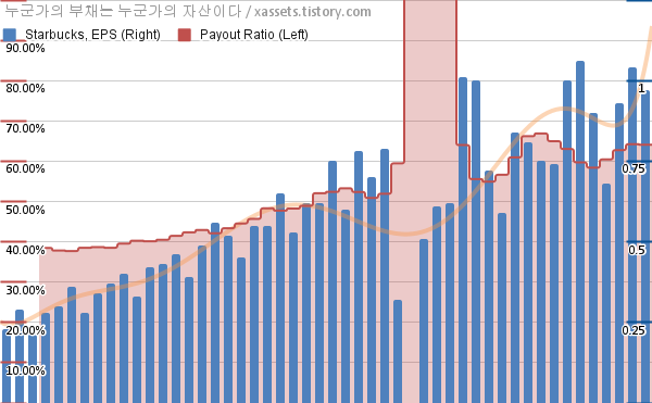 스타벅스 EPS 성장률, 배당성향 차트 (2012년~2024년)