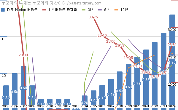 - D.R. 호튼의 연평균 배당성장률은 1년 23.81%, 3년 16.37%, 5년 15.77%, 10년 20.58%이다. (2024년 기준)