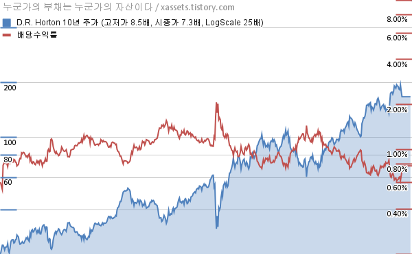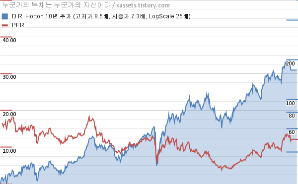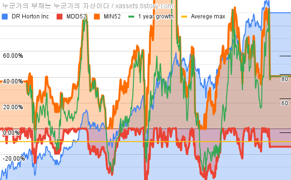 - D.R. 호튼의 10년 평균 MDD는 -10.11%고, 52주 최저가 대비 평균 상승률은 48.70%다.