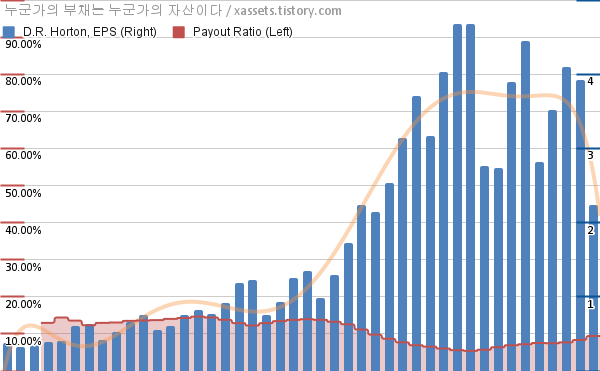 D.R. 호튼 EPS 성장률, 배당성향 차트 (2014년~2024년)