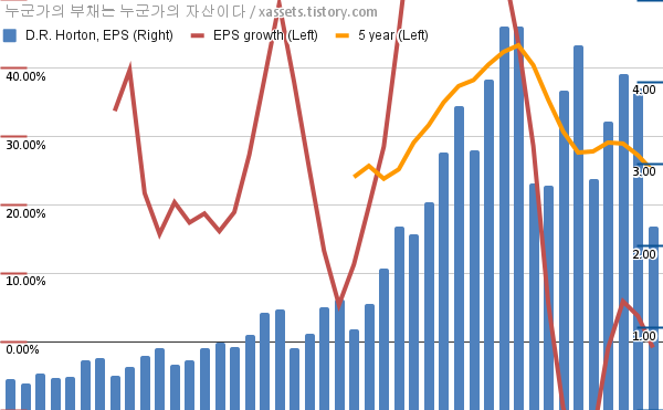- 포스팅일 기준, D.R. 호튼의 1, 5년 연평균 EPS 성장률은 -0.86%, 24.92%이다.