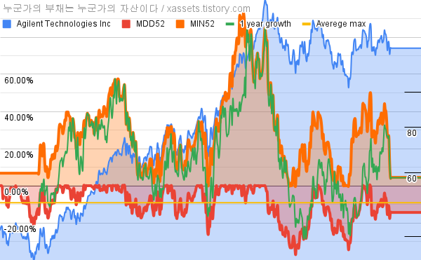 - 애질런트 테크놀로지스의 10년 평균 MDD는 -9.14%고, 52주 최저가 대비 평균 상승률은 30.32%다.