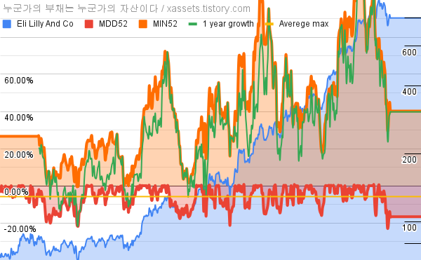 - 엘리 릴리의 10년 평균 MDD는 -5.85%고, 52주 최저가 대비 평균 상승률은 42.37%다.