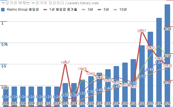 알라모 그룹 배당금 및 배당성장률 차트 (2006년~2025년)
