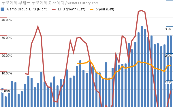 - 포스팅일 기준, 알라모 그룹의 1, 5년 연평균 EPS 성장률은 -0.80%, 13.30%이다.