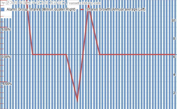 - 포스팅일 기준, 알라모 그룹의 1, 3, 5, 10년 연평균 주가상승률은 -11.79%, 8.00%, 7.70%, 14.26%이다.
