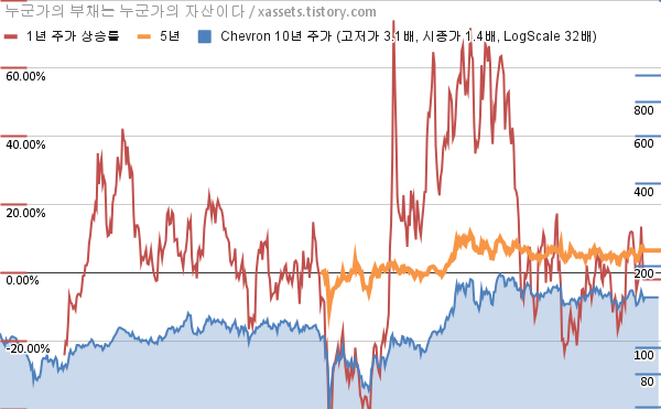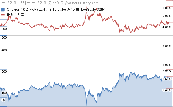 - 포스팅일 기준, 셰브런의 1, 3, 5, 10년 연평균 주가상승률은 -2.00%, 3.16%, 6.49%, 2.84%이다.