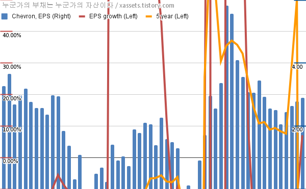 - 포스팅일 기준, 셰브런의 1, 5년 연평균 EPS 성장률은 7.06%, -321.90%이다.