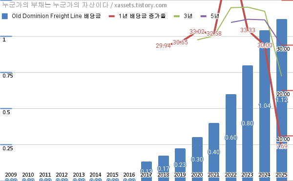 - 지난 2025년 2월 5일에 올드 도미니언 Old Dominion Freight Line (NASDAQ:ODFL)이 배당금 증액을 공시했다. 분기당 배당금이 $0.26에서 $0.28로 전 분기 대비 7.69% 증가하고, 연간 지급 배당금도 전년도 대비 7.69% 증가한다.
