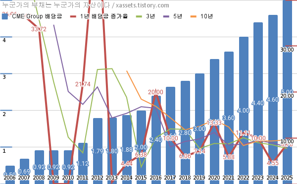 시카고 거래소 그룹 배당금 및 배당성장률 차트 (2006년~2025년)