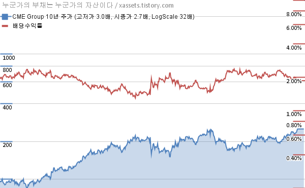 시카고 거래소 그룹 배당수익률 및 주가 상승률 차트 (2015년~2025년)