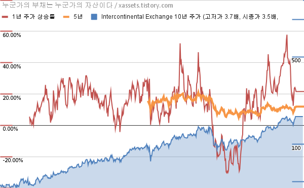 - 포스팅일 기준, 인터컨티넨털 익스체인지의 1, 3, 5, 10년 연평균 주가상승률은 21.58%, 10.71%, 11.96%, 13.48%이다.