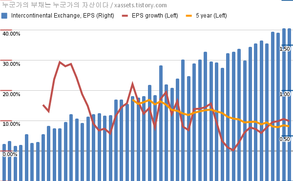 - 포스팅일 기준, 인터컨티넨털 익스체인지의 1, 5년 연평균 EPS 성장률은 9.88%, 8.14%이다.