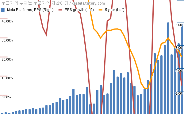 - 포스팅일 기준, 메타 플랫폼스의 1, 5년 연평균 EPS 성장률은 4.97%, 19.98%이다.