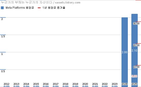 메타 플랫폼스 배당금 및 배당성장률 차트 (2012년~2025년)