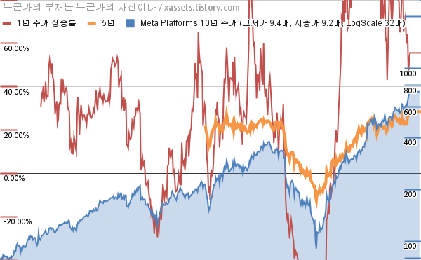 - 포스팅일 기준, 메타 플랫폼스의 1, 3, 5, 10년 연평균 주가상승률은 55.64%, 52.88%, 28.51%, 25.02%이다.