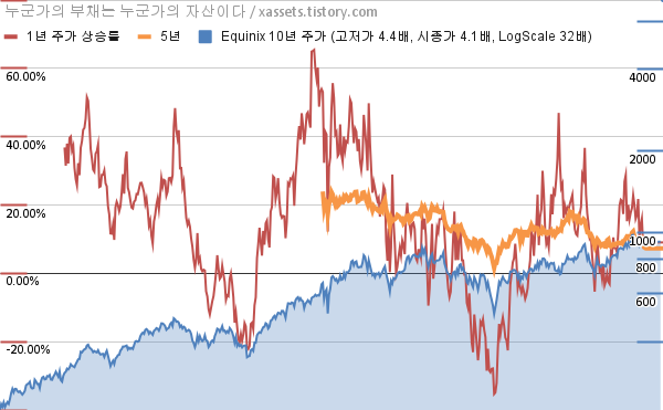 - 포스팅일 기준, 에퀴닉스의 1, 3, 5, 10년 연평균 주가상승률은 9.04%, 10.45%, 7.31%, 15.33%이다.