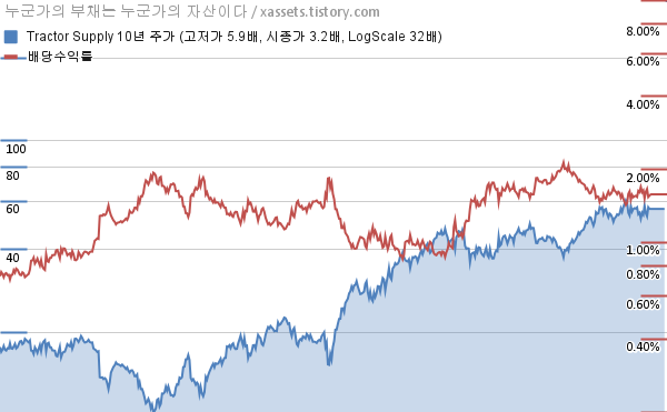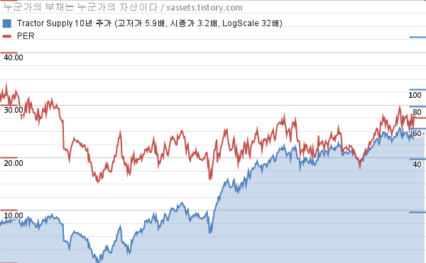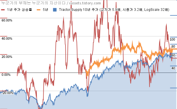 - 포스팅일 기준, 트랙터 서플라이의 1, 3, 5, 10년 연평균 주가상승률은 15.96%, 11.99%, 26.07%, 12.78%이다.