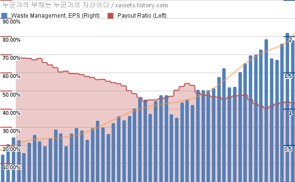 웨이스트 매니지먼트 EPS 성장률, 배당성향 차트 (2012년~2025년)