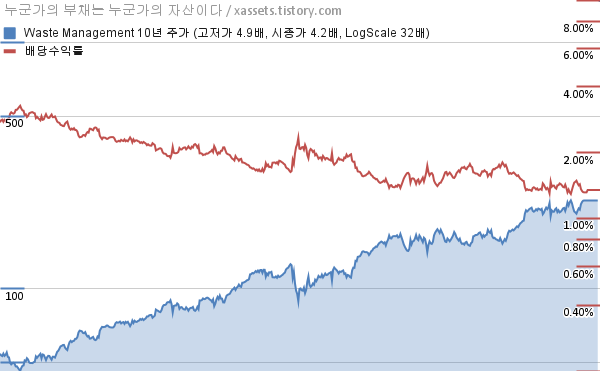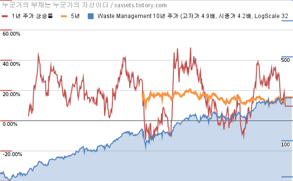 - 포스팅일 기준, 웨이스트 매니지먼트의 1, 3, 5, 10년 연평균 주가상승률은 9.60%, 16.25%, 15.53%, 15.57%이다.