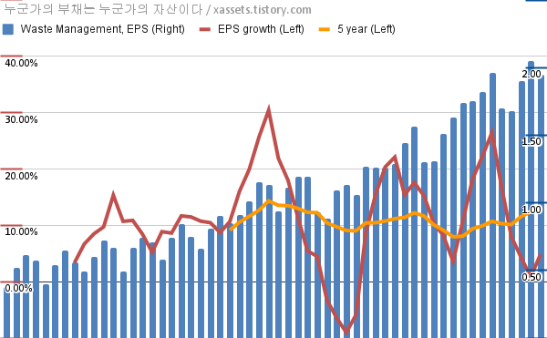 - 포스팅일 기준, 웨이스트 매니지먼트의 1, 5년 연평균 EPS 성장률은 4.84%, 13.47%이다.