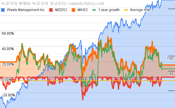 - 웨이스트 매니지먼트의 10년 평균 MDD는 -4.58%고, 52주 최저가 대비 평균 상승률은 25.20%다.