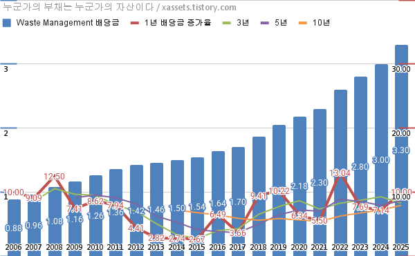 - 웨이스트 매니지먼트의 연평균 배당성장률은 1년 10.00%, 3년 8.27%, 5년 8.65%, 10년 7.92%이다. (2025년 기준)