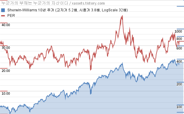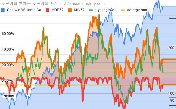 - 셔윈 윌리엄즈의 10년 평균 MDD는 -8.06%고, 52주 최저가 대비 평균 상승률은 33.10%다.
