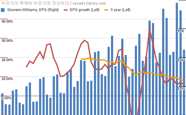 - 포스팅일 기준, 셔윈 윌리엄즈의 1, 5년 연평균 EPS 성장률은 6.00%, 7.96%이다.