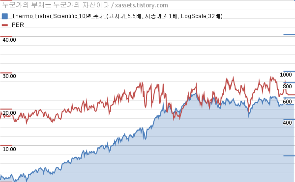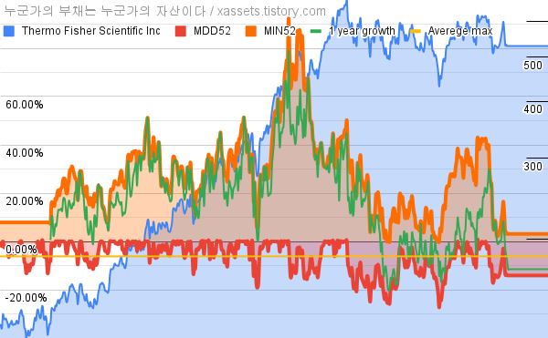 - 써모피셔 사이언티픽의 10년 평균 MDD는 -6.16%고, 52주 최저가 대비 평균 상승률은 28.52%다.